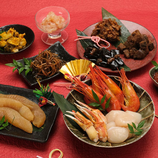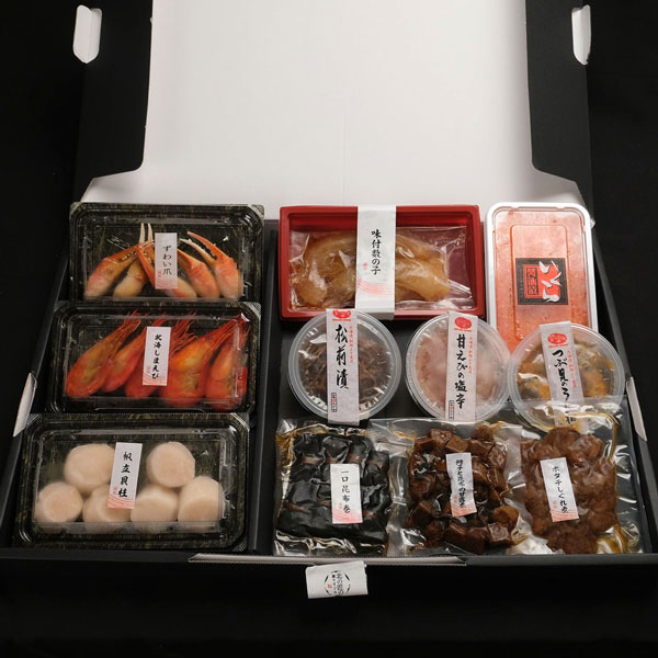 | 原材料表示 | ほたて貝柱:ほたて貝柱(北海道オホーツク海産)、北海しまえび:しまえび(根室海峡沖)、食塩、ずわいがに爪:ずわいがに(ロシア産)、いくら醤油漬け:鮭卵(北海道産)、醤油、水飴、米発酵調味料、砂糖、糖蜜、果糖ブドウ糖液糖、食塩、昆布/調味料(アミノ酸等)、(一部に小麦・大豆・いくらを含む)、味付け数の子:にしんの卵(カナダ、大西洋産)、醤油、米発酵調味料、魚介エキス、コンブエキス/調味料(アミノ酸等)、ソルビトール、トレハロース、甘味料(ステビア)(一部に小麦・大豆・ゼラチン・鶏・さばを含む)つぶ貝のうに和え:つぶ貝(北海道)、塩うに、酒粕、本味醂/酒精、調味料(アミノ酸等)、着色料(カロテノイド)(一部に大豆・ゼラチンを含む)、ほたてしぐれ煮:ほたて(北海道産)、砂糖、しょうゆ、本みりん(一部に小麦・大豆を含む)松前漬け:真いかするめ(北海道製)、昆布、醤油、麦芽糖水飴/ソルビット、酒精、調味料(アミノ酸等)(一部に小麦・大豆・いかを含む)甘えびの塩辛:甘えび(グリーンランド)、麦芽液糖水飴、本みりん、こうじ、米発酵調味料、醤油、唐辛子、香辛料/トレハロース、ソルビット、酒精(一部に小麦・えび・大豆を含む)たらこと昆布の旨煮:マダラの卵(北海道産)、砂糖、醤油、昆布、本みりん(一部に小麦、大豆を含む)昆布巻き(一口):昆布(国産)、干瓢、砂糖、醤油、本みりん(一部に小麦・大豆を含む) |