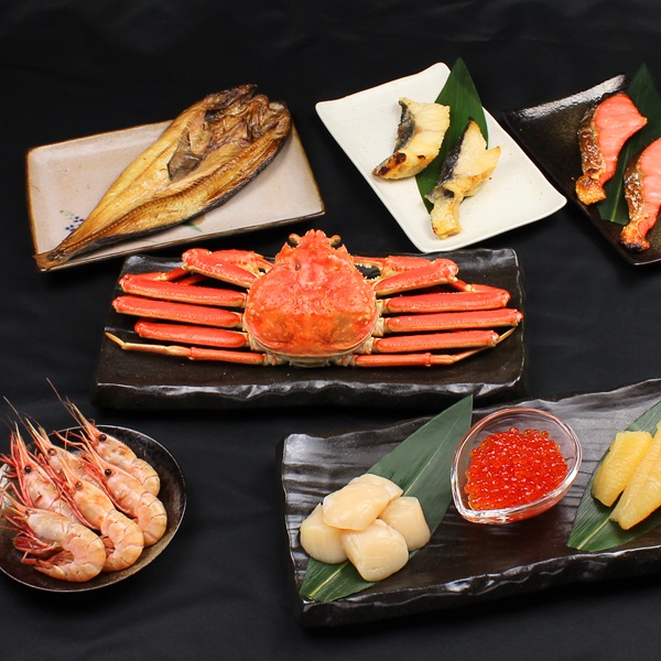 | 原材料表示 | 本ズワイガニ姿400g:ズワイガニ(カナダ又はロシア産)、食塩、ホタテ貝柱:ホタテ(北海道産)、いくら醤油漬け60g:鮭卵(北海道)、醤油、水飴、米発酵調味料、砂糖、糖蜜、果糖ブドウ糖液糖、食塩、昆布/調味料(アミノ酸等)、(一部に小麦、大豆・いくらを含む)、ぼたんえび100g:ぼたんえび(北海道産)、味付数の子:にしんの卵(カナダ産(大西洋)又はヨーロッパ産)、醤油、魚介エキス、米発酵調味料、還元水飴、醸造酢、昆布エキスパウダー/調味料(アミノ酸等)食塩、ソルビトール、トレハロース、pH調整剤、甘味料(ステビア)、(一部に小麦・大豆・ゼラチン・さばを含む)、ほっけ開き干し:ほっけ(北海道産)、食塩、天然紅鮭2切れ:紅鮭(アメリカ又はロシア産)、食塩/酸化防止剤 (ビタミンC)、(一部にさけを含む)、真だら西京漬け2切れ:真だら(北海道産)、味噌、砂糖、米発酵調味料、清酒、食塩、酵母エキス、(一部に大豆を含む) |