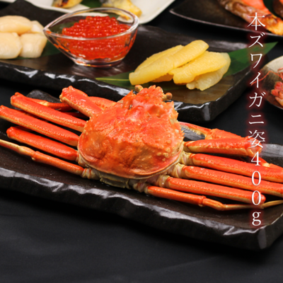 | 商品情報 | 本ズワイガニ姿入り海鮮8品詰め合わせ 内容量:ボイルずわいがに1尾(約400g)、ほたて貝柱80g、いくら醤油漬60g、ぼたんえび100g、味付数の子(折れ)80g、開きほっけ1枚(約150g)、塩紅鮭切身2切(計120g、甘口)、真だら西京漬70g×2切 |