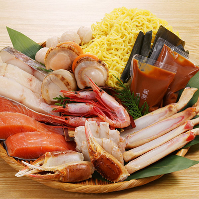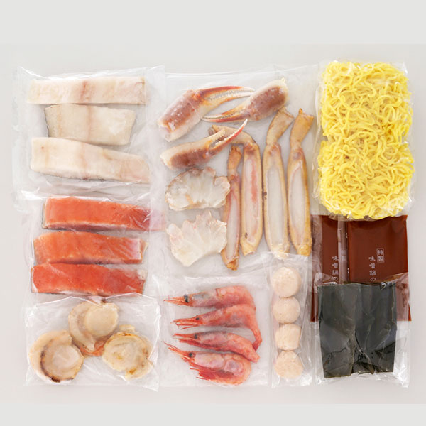 | 原材料表示 | ラーメン(小麦、卵白、食塩)(国内製造)、生ずわいがに(ロシア)、鮭(北海道)、タラ(北海道)、帆立(北海道)、南蛮エビ(ロシア)、かに入り団子(たら、砂糖、かに、食塩、かにエキス、植物油脂、酵母エキス)、味噌たれ(味噌、砂糖、料理酒、食塩、昆布エキス、カツオエキス)(国内製造)、昆布(北海道)/加工でんぷん、かんすい、クチナシ色素、ビタミンB2、増粘剤(加工澱粉、キサンタンガム)、酸化防止剤(ビタミンC、亜硫酸Na)、pH調整剤、調味料(アミノ酸等)、酒精、カラメル色素、(一部にかに・さけ・えび・小麦・卵・大豆・サバを含む) |