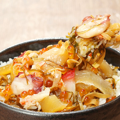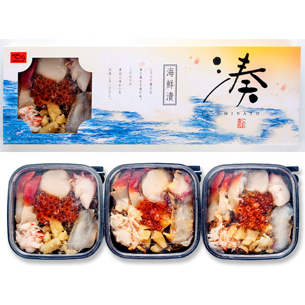 | 商品情報 | 海鮮漬(数の子、ずわいがに、ひらめ、いくら、たこ、ほたて、カナダほっき入り松前漬) 100g×3パック 北海道名産の松前漬に、数の子、ずわいがに、ひらめ、いくら、たこ、ほたて、カナダほっき、7種の海の幸を贅沢にちりばめました。混ぜてご飯にかけて海鮮丼としてもお召し上がりいただけます。 |