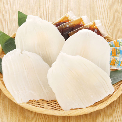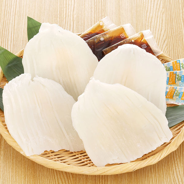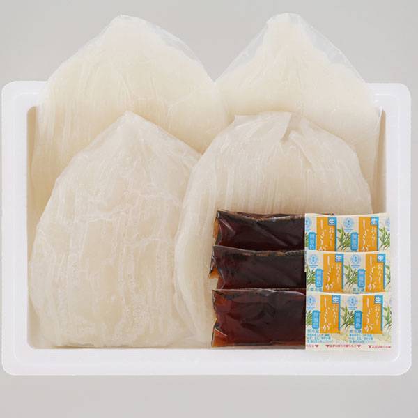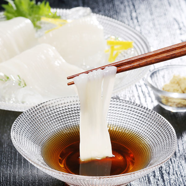 | 商品情報 | いか3~4枚(計240g)(北海道産)、タレ20g×3、しょうが2.5g×3 いか漁の本場函館のご当地グルメ「いかそうめん」。 そうめんの様に細くカットしたいかに合うこだわりのいかそうめん専用つけたれもセットです。 本場函館の味わいをご家庭でお召し上がりください。 |